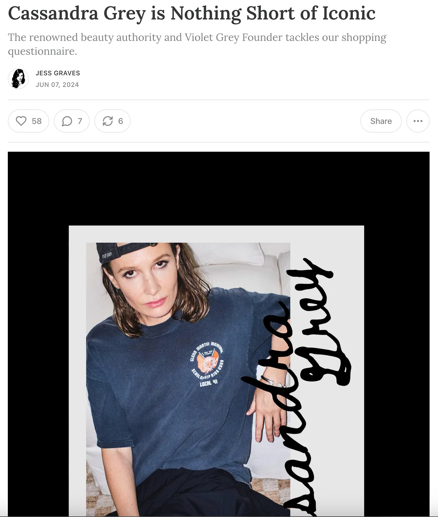 A bunch of other things too: Beauty Editor, Curator of Nice Things, Creative Director, Angel Investor, world-builder, plastic surgery advisor, recovering addict with a mild case of OCD, double Aries with Libra rising, @caroleradzilwill’s best friend and most trusted confidante, Cat Lady with Cat Moss, writer, White Luggage Traveler, stylist, interior designer, farmer, Robert Evans’ goddaughter, master manifestor, discerning consumer, art collector, book publisher, injectable peptide, NAD, and HRT expert, and a best-selling Substacker, Editor-in-Chief of Please Note by Cassandra Grey.